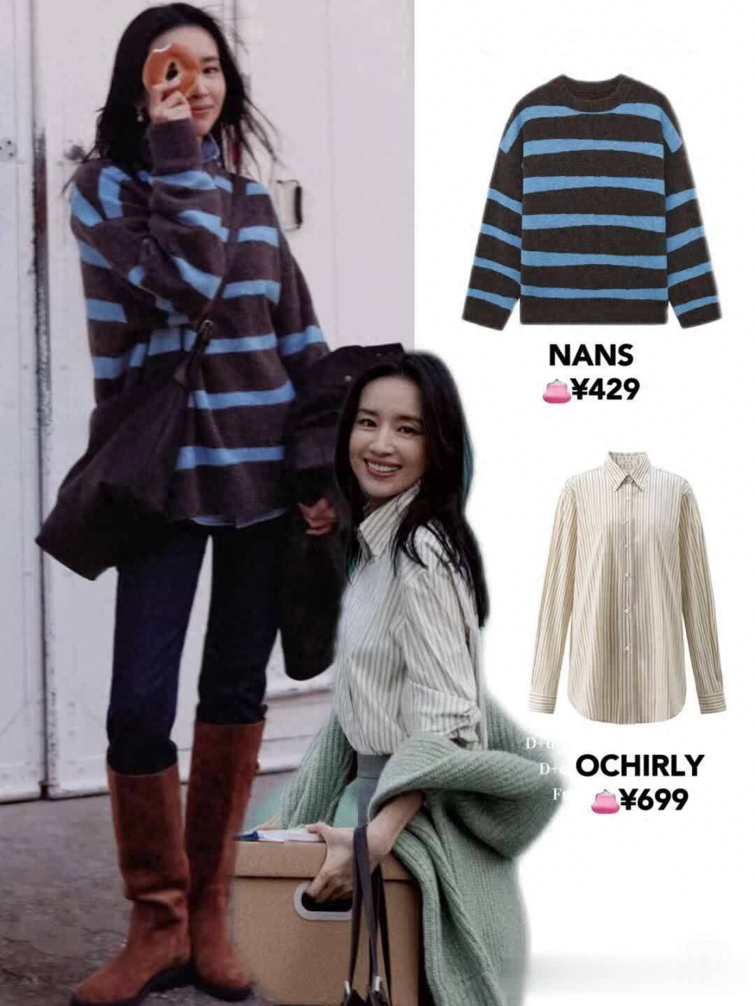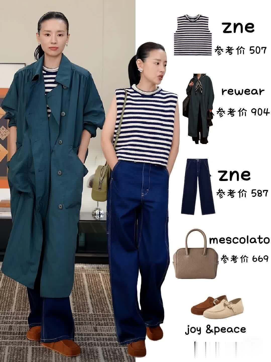 关键是配色太绝了!孔雀蓝风衣和深蓝色裤子,属于同色系不同深浅的撞色,和谐又有层次,再用条纹背心的白色过渡,整体特别舒服。而且单品都很“实穿抗造”:风衣是那种挺括又柔软的面料,春秋挡风没问题;条纹背心单穿、内搭都好看;阔腿裤更是梨形身材救星,胯宽腿粗全遮住,还显腿长。